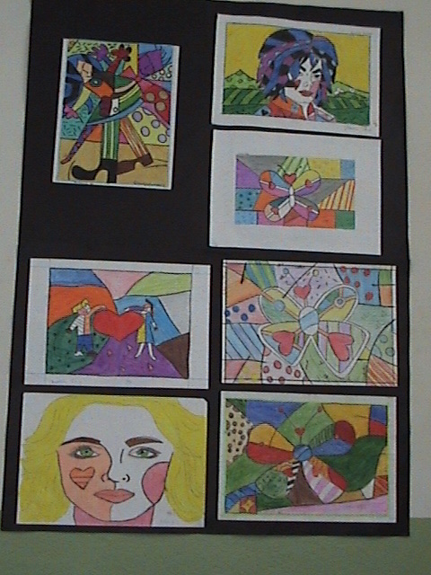 Os alunos das turmas Hs (8º ano) e Is (9º ano), reproduziram pinturas de Romero Britto nas aulas de Arte, sob orientação da professora Jane.